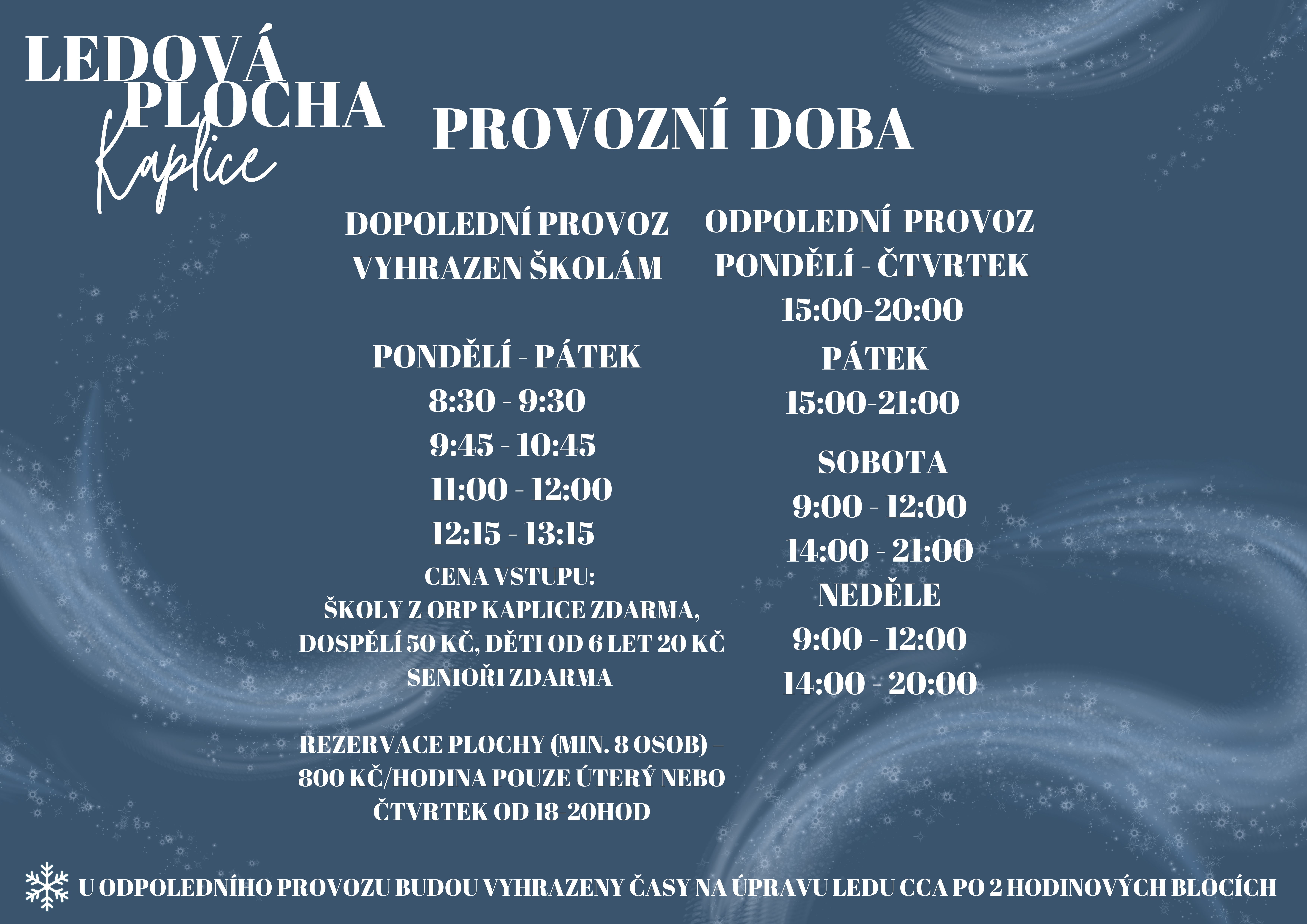 Město Kaplice informuje veřejnost o provozu nového mobilního kluziště umístěného v městském parku. Provoz je rozdělen na dopolední bloky určené školám a odpolední provoz pro širokou veřejnost. Dopolední provoz je vyhrazen školám z ORP Kaplice a probíhá od pondělí do pátku v časech 8:30–9:30, 9:45–10:45, 11:00–12:00 a 12:15–13:15. Tyto bloky jsou určeny výhradně pro organizované školní skupiny po předchozí rezervaci.