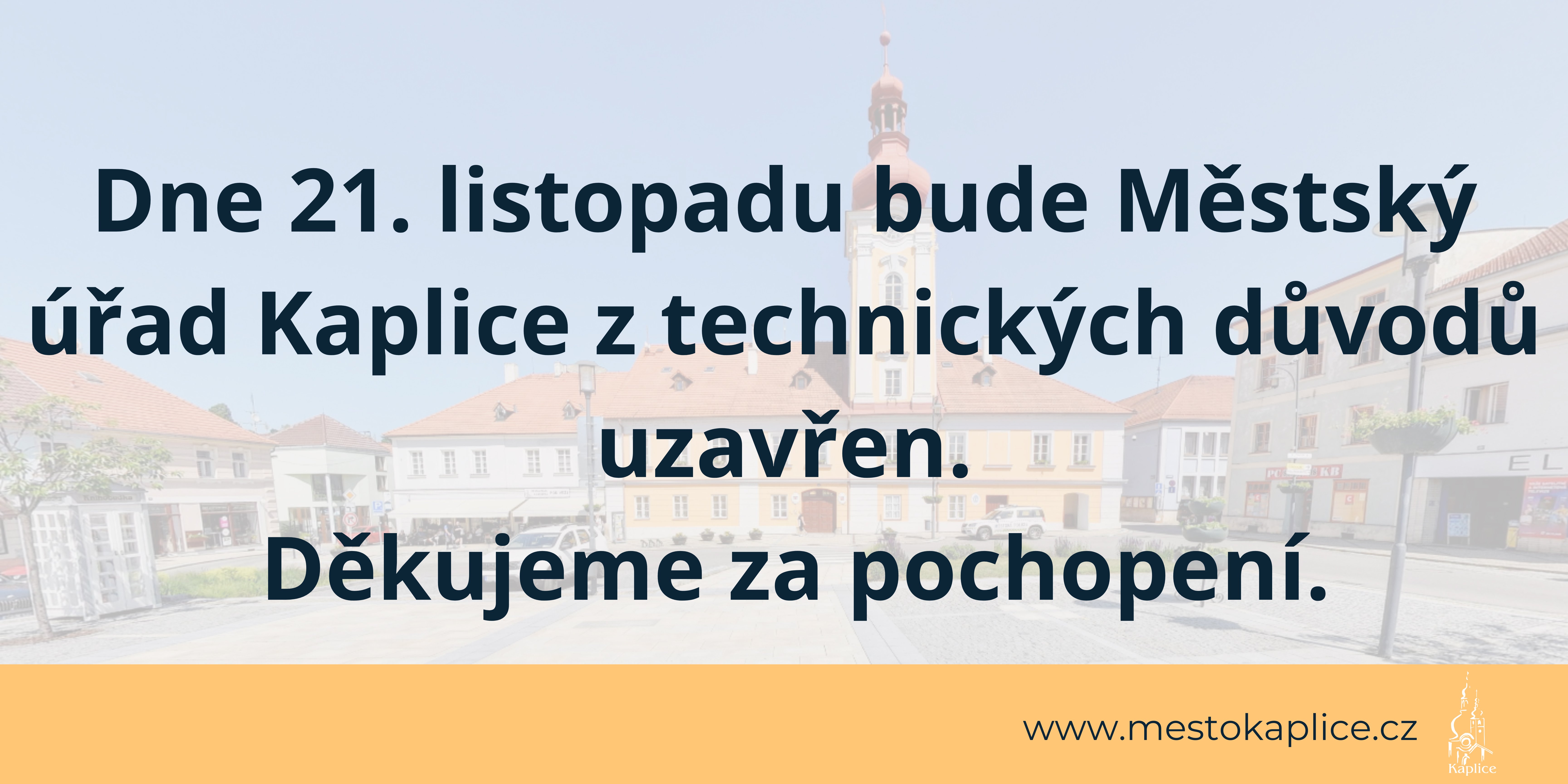 Oznamujeme vám, že z důvodu přepojení části nového vodovodu a vodovodních přípojek v Kaplici v ul. Luční, bude dne 29.10.2025 přerušena dodávka pitné vody v této ulici. Odstávka pitné vody se týká nemovitostí od č.p. 549 - 560 + č.p. 568-573 a č.p. 593. Předpoklad odstávky je 8:00 – 13:00 hodin. V uvedeném čase bude v ulici přistavena cisterna s pitnou vodou.